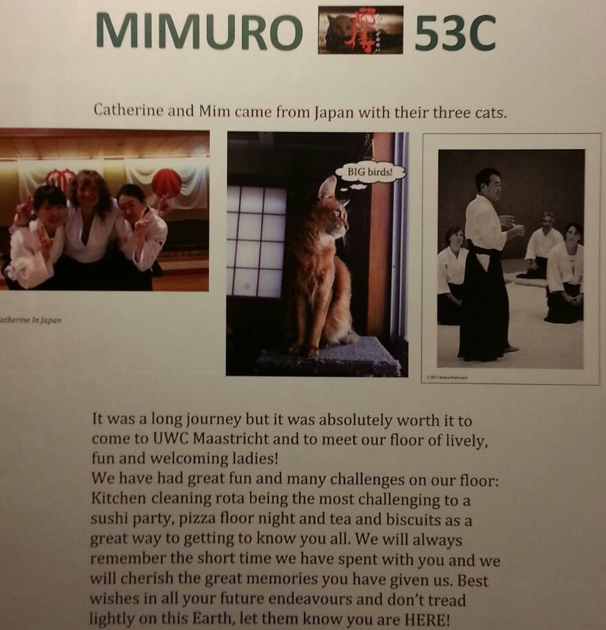 オランダ時間の8月18日午後3時にアムステルダムのスキポール空港に予定通り到着しました。 マーストリヒトの合気道仲間が車で迎えに来てくれたので、空港から200km以上離れたマーストリヒトに私とキャシーと3匹の猫は約時間かけて無事着きました。 スキポール空港からマーストリヒトに3時間で到着しました。 私たちが滞在するのは、UWC(United World College)というインターナショナルスクールの敷地内で、寮のようなアパートメントハウスです。 アパートといっても日本式に言うとマンションのような部屋ですが、私たちの住むのは3階部分の一角で、3階の他の部分は24人の学生の宿泊施設です。 そこで私たち(mimとcat)はスクールペアレンツとして学生たちと寮生活をすることになります。 学校は休暇期間中なので、まだ閑散としていますが、9月から授業が始まるので、来週から忙しくなりそうです。 最初に学校に慣れて、生活も順調になってから合気道を本格的に始めようと思っています。 |