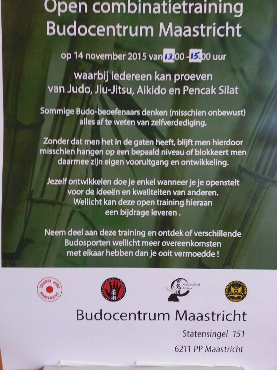 マーストリヒトから北東方向に約50km離れた ルールモント (Roermond)で11月9日(日)10:00〜13:00 に講習会が決まりました。 この日の講習会には、マーストリヒト道場はもちろんですが、イギリスのマープル道場からも参加があるようです。 また、現在、私達が住んでいる UWC (United World College)の体育館又は学校の近くの柔道場で、学生を対象とした合気道クラブを始める予定です。 |